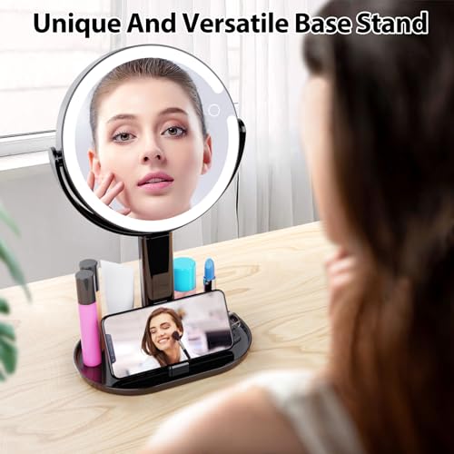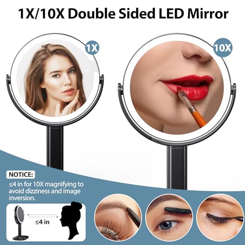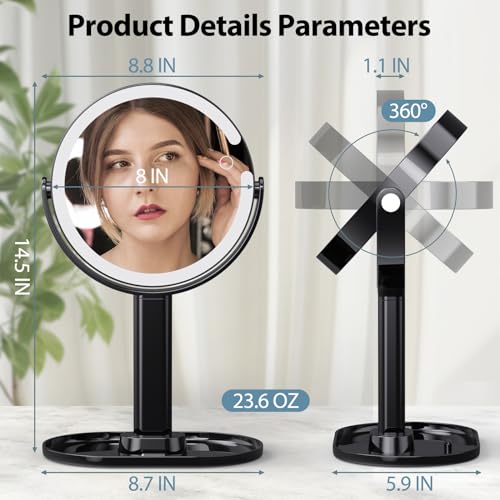 8″ Lighted Makeup Mirror with Magnification, 1X/10X Magnifying Mirror with Light, Rechargeable Double Sided LED Vanity Mirror, 360° Rotation Light up Mirror 3 Colors Brightness Adjustable, Black