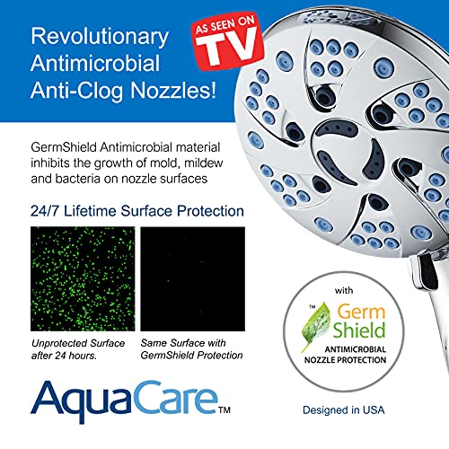 PURE-CLEAN PROTECTION – Studies show that ordinary shower heads are often infested with grime that rapidly grows overnight, then gets flashed out in your face with the morning shower. That’s why keeping your showerhead clean is essential for good shower hygiene. AquaCare nozzles are made with special revolutionary material that works 24/7 on molecular level to protect from degradation. This protection is 100% safe and effective for the life of the product and can never wear off