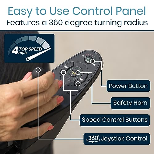 EASY TO OPERATE: Featuring a 360-degree, joystick controller, our electric wheelchair is easy to operate. The intuitive joystick controller allows you to easily navigate around obstacles while monitoring and adjusting the speed of the electric wheelchair up to 4mph. The wheelchair controller is repositionable for use on the left or right side and includes a safety horn button and a battery charge indicator.